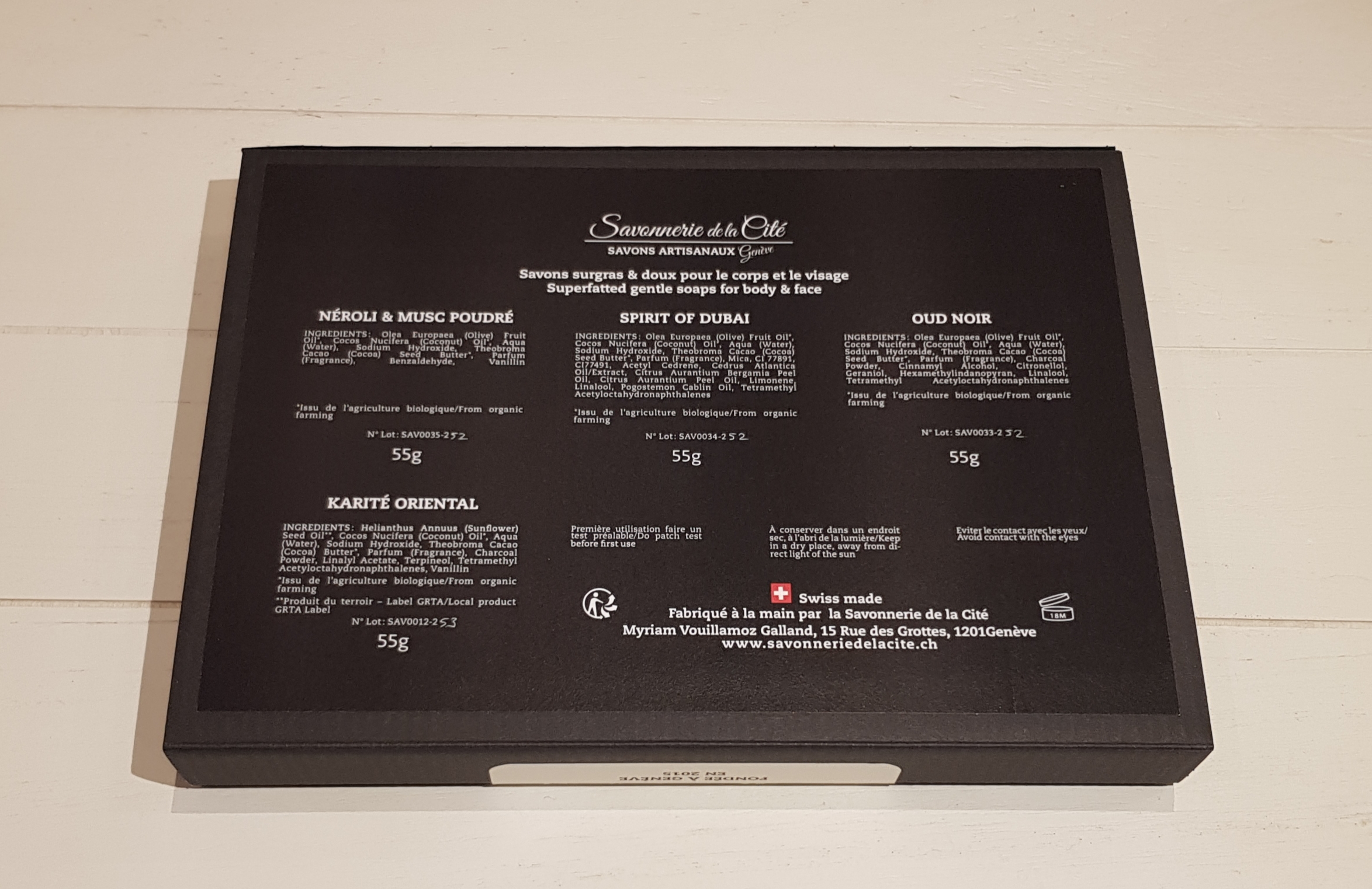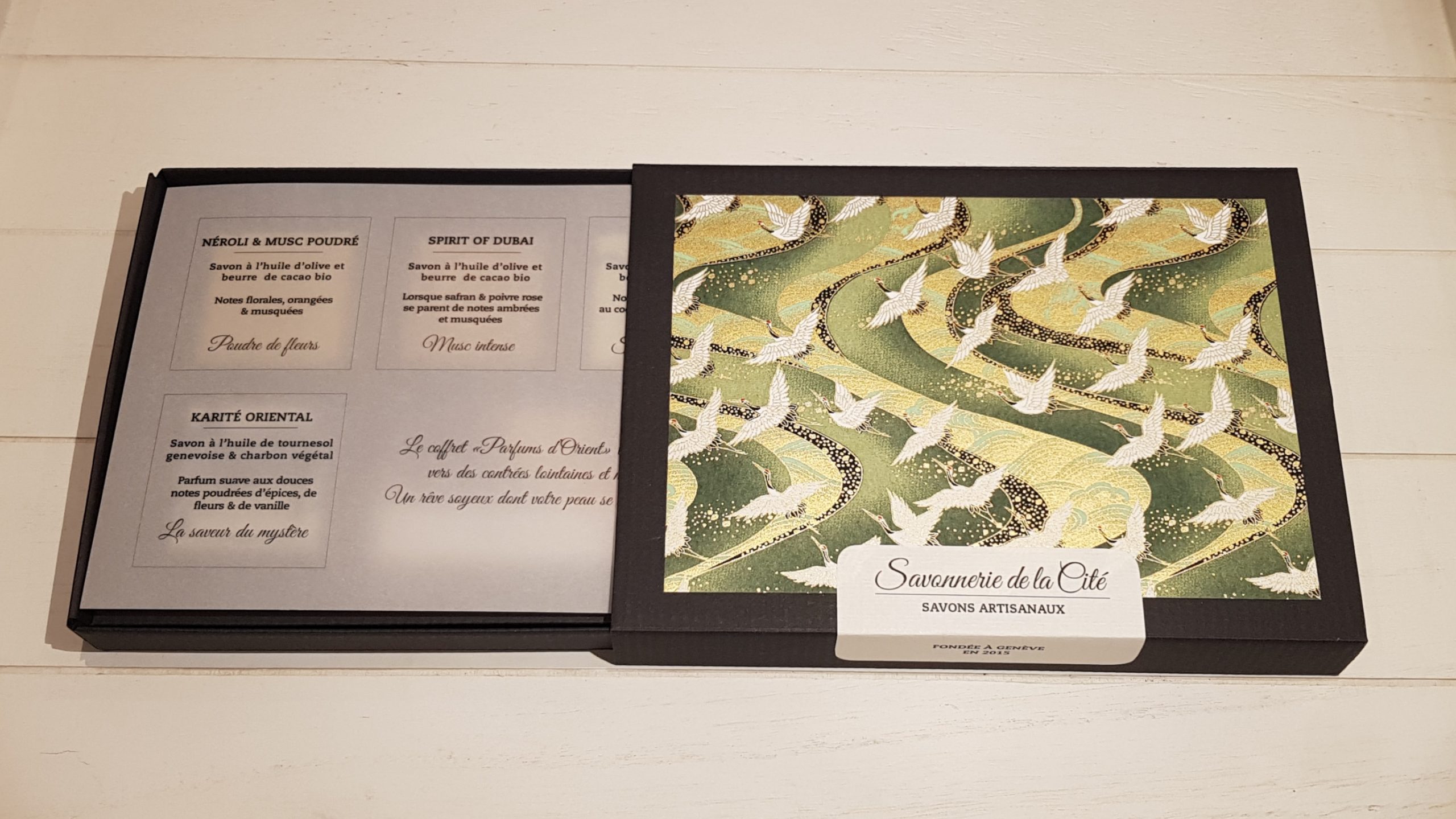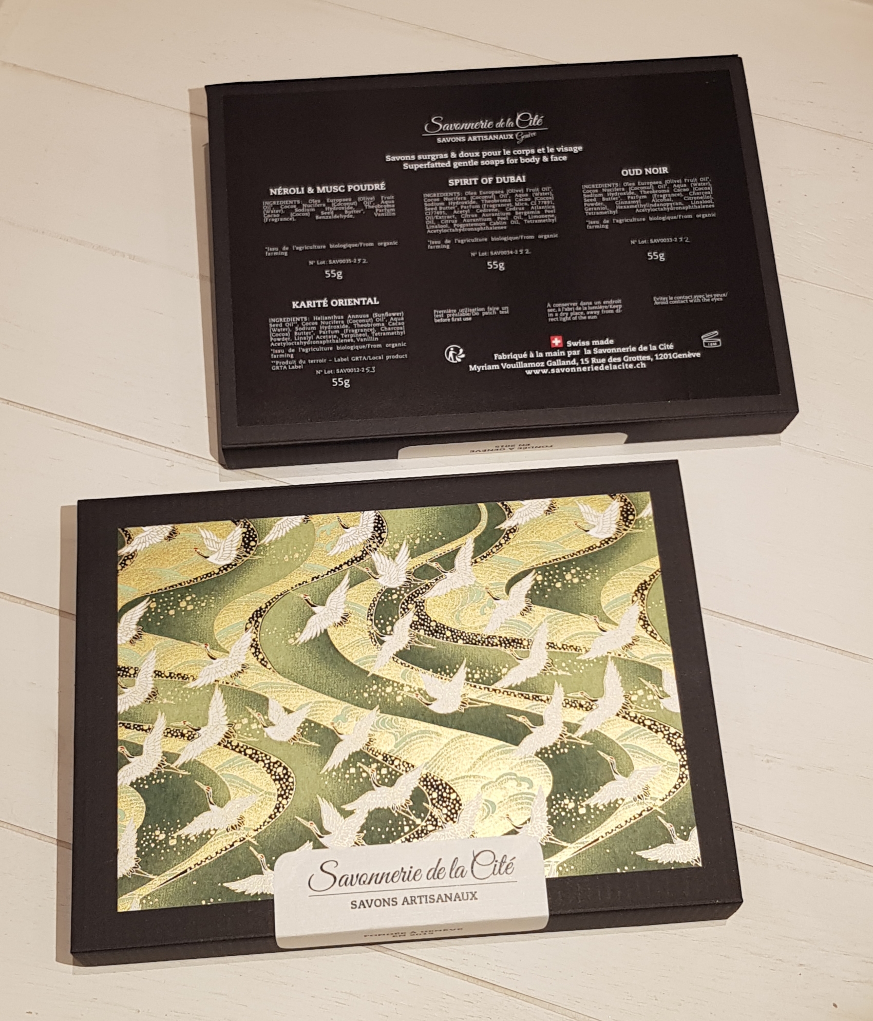 Orné d’une sélection de luxueux papiers japonais (Chiyogami) ou népalais, tous de facture artisanale, il se décline en 4 savons aux senteurs orientales. Les savons sont fabriqués à la main dans notre atelier à Genève et tous les coffrets sont montés à la main également dans notre atelier.